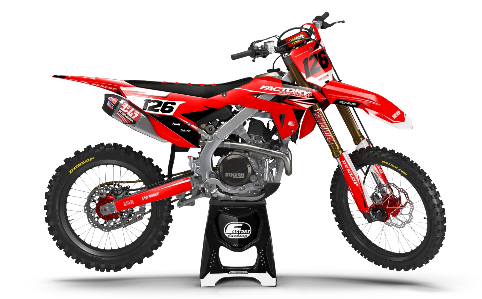 Vollständige Grafikkits werden auf Wunsch mit dem Logo Ihres Sponsors, Ihrer Nummer und Ihren Farben auf das beste Vinyl der Branche von Substance® gedruckt. Die meisten Modelle umfassen Grafiken für Abdeckungen, Frontspitze, hinteren Kotflügel, Seiten/Frontplatte, Schwinge und Gabelaufkleber.