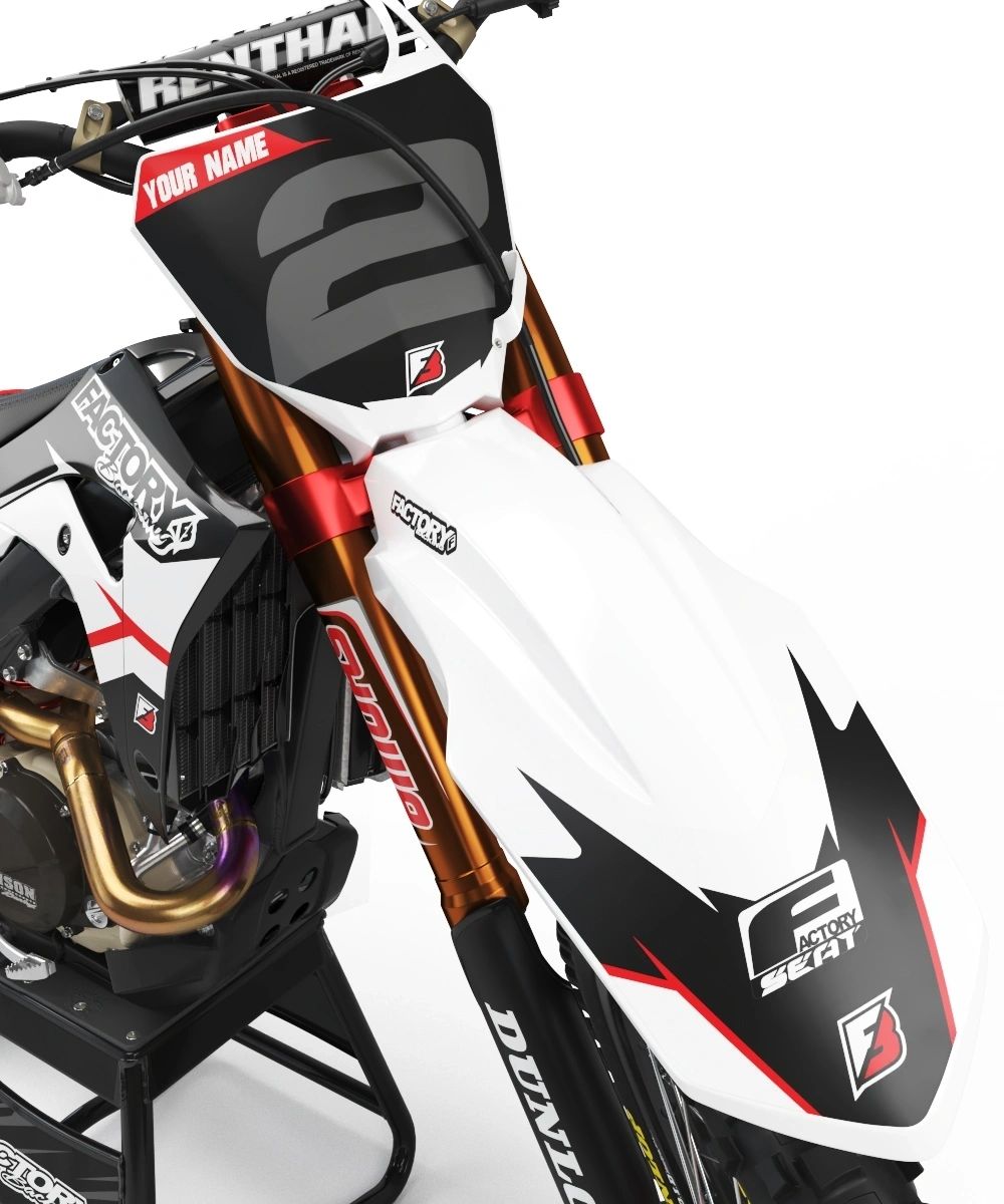 Vollständige Grafikkits werden auf Wunsch mit dem Logo Ihres Sponsors, Ihrer Nummer und Ihren Farben auf das beste Vinyl der Branche von Substance® gedruckt. Die meisten Modelle umfassen Grafiken für Abdeckungen, Frontspitze, hinteren Kotflügel, Seiten/Frontplatte, Schwinge und Gabelaufkleber.