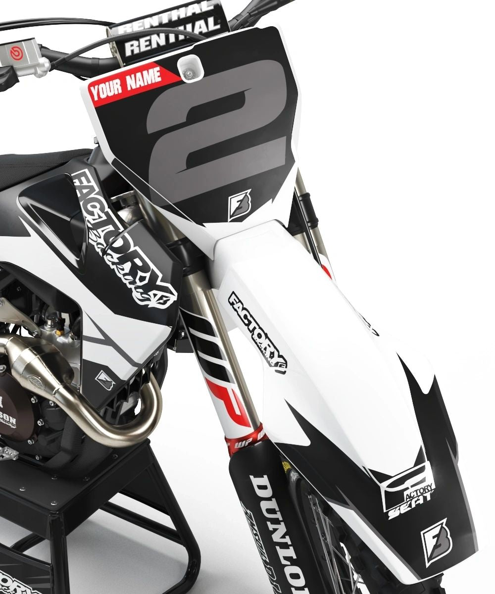 Vollständige Grafikkits werden auf Wunsch mit dem Logo Ihres Sponsors, Ihrer Nummer und Ihren Farben auf das beste Vinyl der Branche von Substance® gedruckt. Die meisten Modelle umfassen Grafiken für Abdeckungen, Frontspitze, hinteren Kotflügel, Seiten/Frontplatte, Schwinge und Gabelaufkleber.