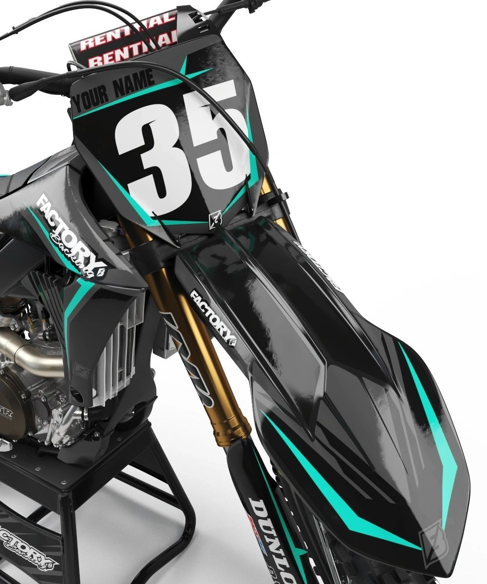 Vollständige Grafikkits werden auf Wunsch mit dem Logo Ihres Sponsors, Ihrer Nummer und Ihren Farben auf das beste Vinyl der Branche von Substance® gedruckt. Die meisten Modelle umfassen Grafiken für Abdeckungen, Frontspitze, hinteren Kotflügel, Seiten/Frontplatte, Schwinge und Gabelaufkleber.