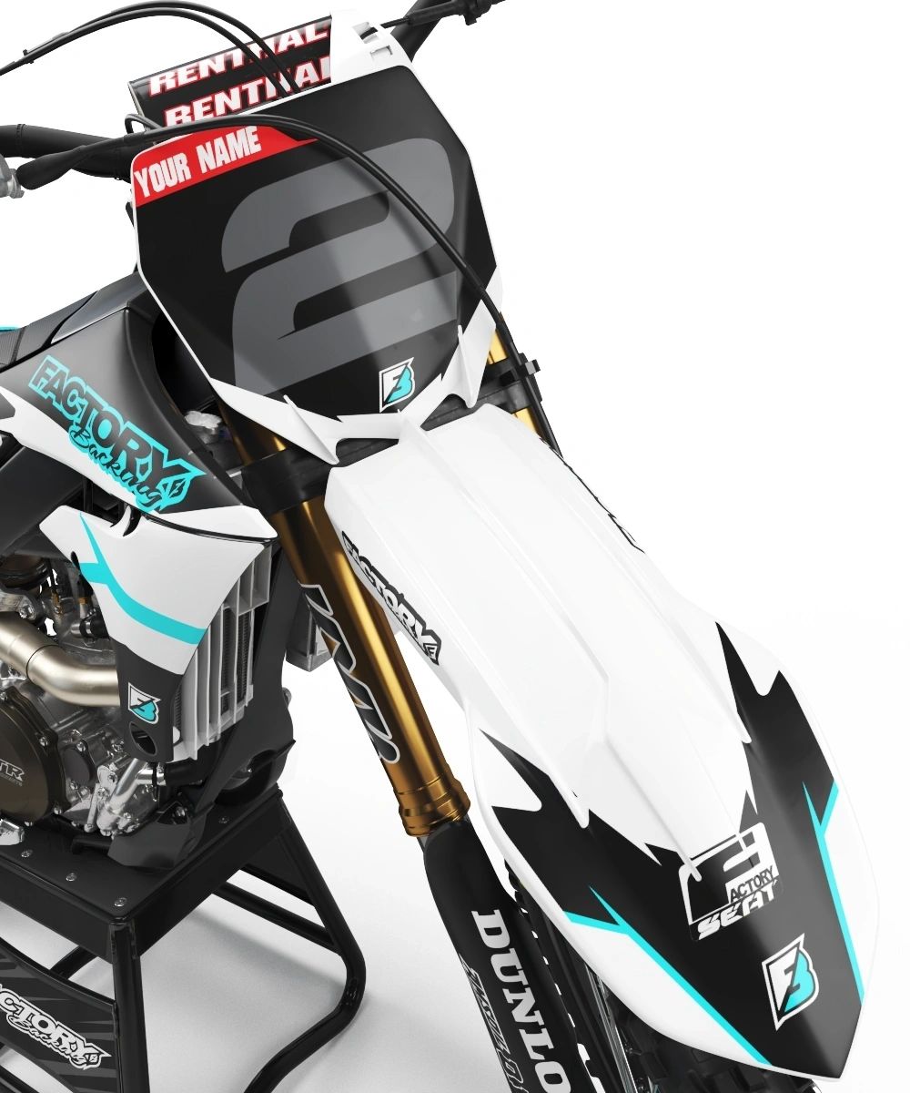 Vollständige Grafikkits werden auf Wunsch mit dem Logo Ihres Sponsors, Ihrer Nummer und Ihren Farben auf das beste Vinyl der Branche von Substance® gedruckt. Die meisten Modelle umfassen Grafiken für Abdeckungen, Frontspitze, hinteren Kotflügel, Seiten/Frontplatte, Schwinge und Gabelaufkleber.
