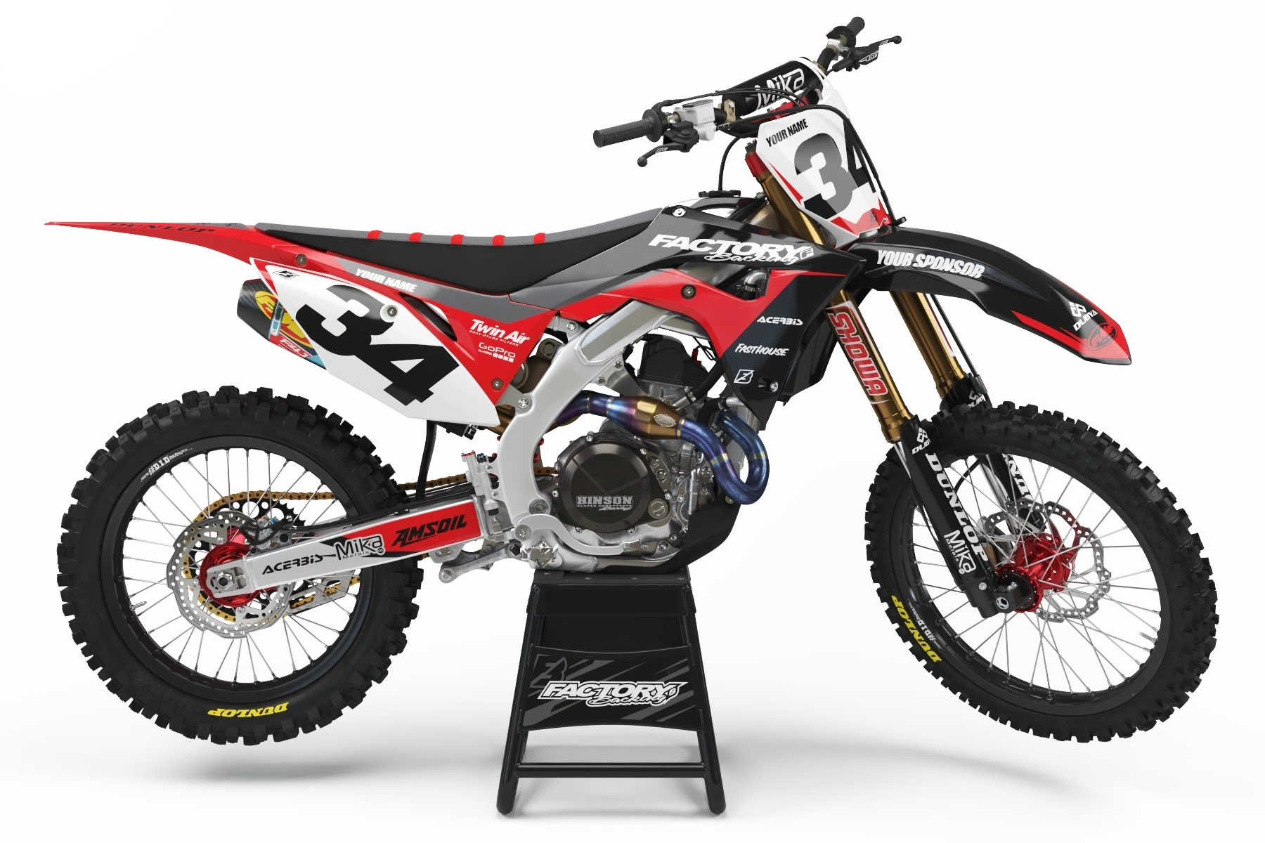 Les kits graphiques complets sont personnalisés avec le logo de votre sponsor si vous le souhaitez, votre numéro et vos couleurs imprimés sur le meilleur vinyle de l'industrie par Substance®. La plupart des modèles incluent des graphiques pour les carénages, la pointe avant, le garde-boue arrière, la plaque latérale/avant, le bras oscillant et les autocollants de fourche.