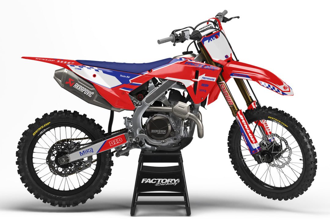 Les kits graphiques complets sont personnalisés avec le logo de votre sponsor si vous le souhaitez, votre numéro et vos couleurs imprimés sur le meilleur vinyle de l'industrie par Substance®. La plupart des modèles incluent des graphiques pour les carénages, la pointe avant, le garde-boue arrière, la plaque latérale/avant, le bras oscillant et les autocollants de fourche.