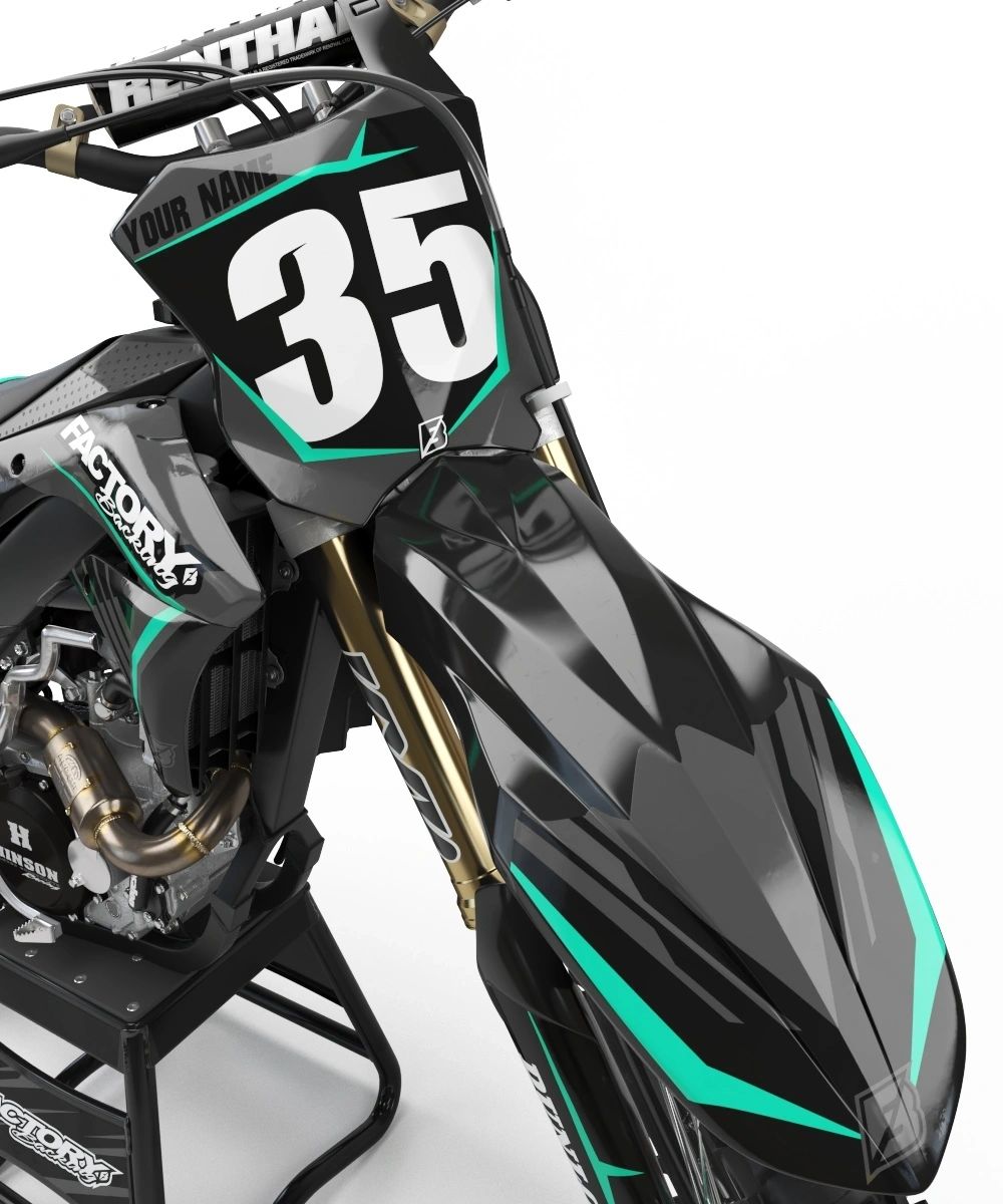 Les kits graphiques complets sont personnalisés avec le logo de votre sponsor si vous le souhaitez, votre numéro et vos couleurs imprimés sur le meilleur vinyle de l'industrie par Substance®. La plupart des modèles incluent des graphiques pour les carénages, la pointe avant, le garde-boue arrière, la plaque latérale/avant, le bras oscillant et les autocollants de fourche.