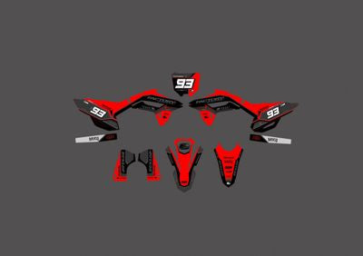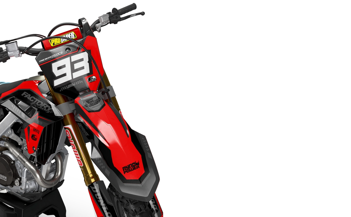 Full  graphic kits come custom with your sponsors logo if desired, your number and colors printed on the industry's best vinyl by Substance®. Most models include graphics for shrouds, front tip, rear fender,  sides/front plate, swing arm, and fork decals.