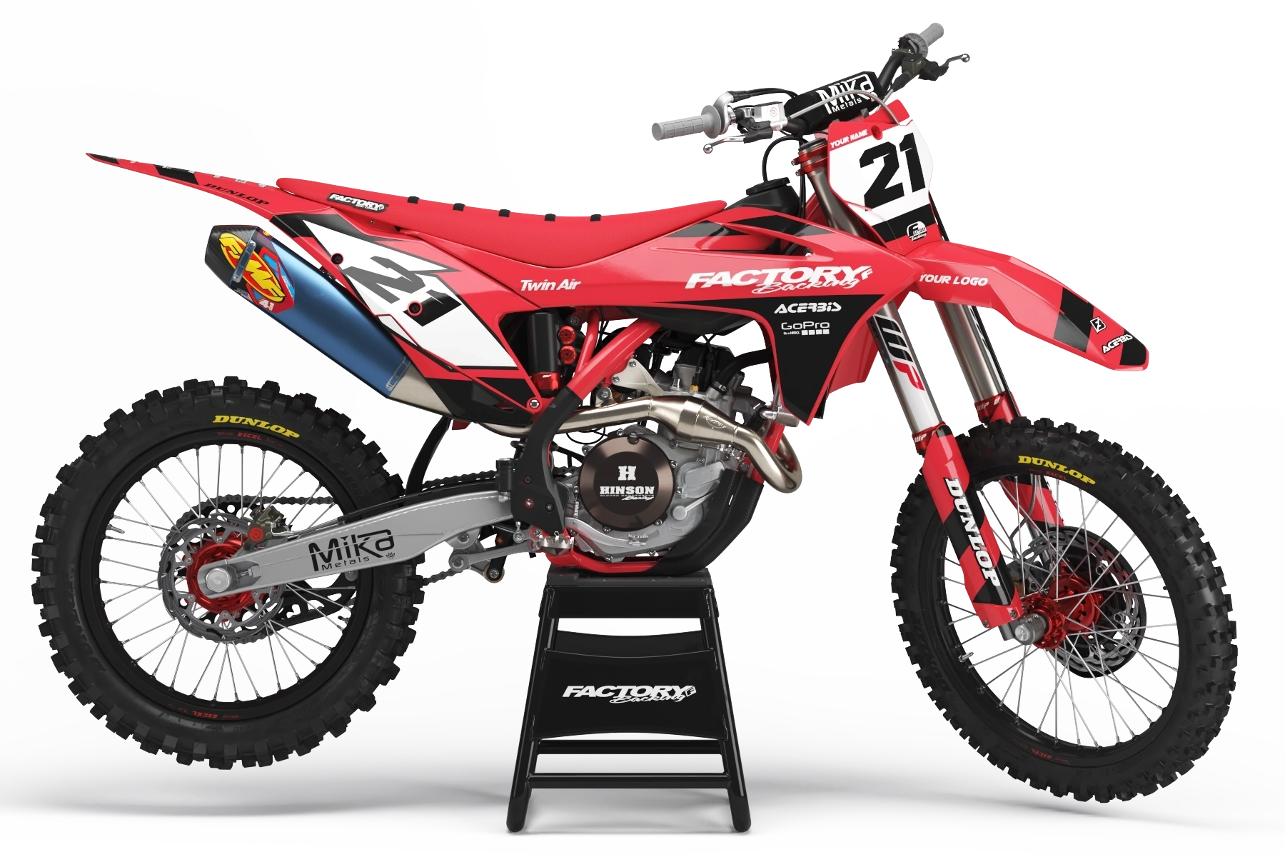 Full  graphic kits come custom with your sponsors logo if desired, your number and colors printed on the industry's best vinyl by Substance®. Most models include graphics for shrouds, front tip, rear fender,  sides/front plate, swing arm, and fork decals.