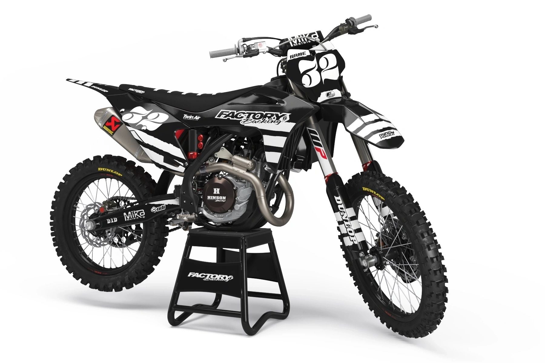 Full  graphic kits come custom with your sponsors logo if desired, your number and colors printed on the industry's best vinyl by Substance®. Most models include graphics for shrouds, front tip, rear fender,  sides/front plate, swing arm, and fork decals.