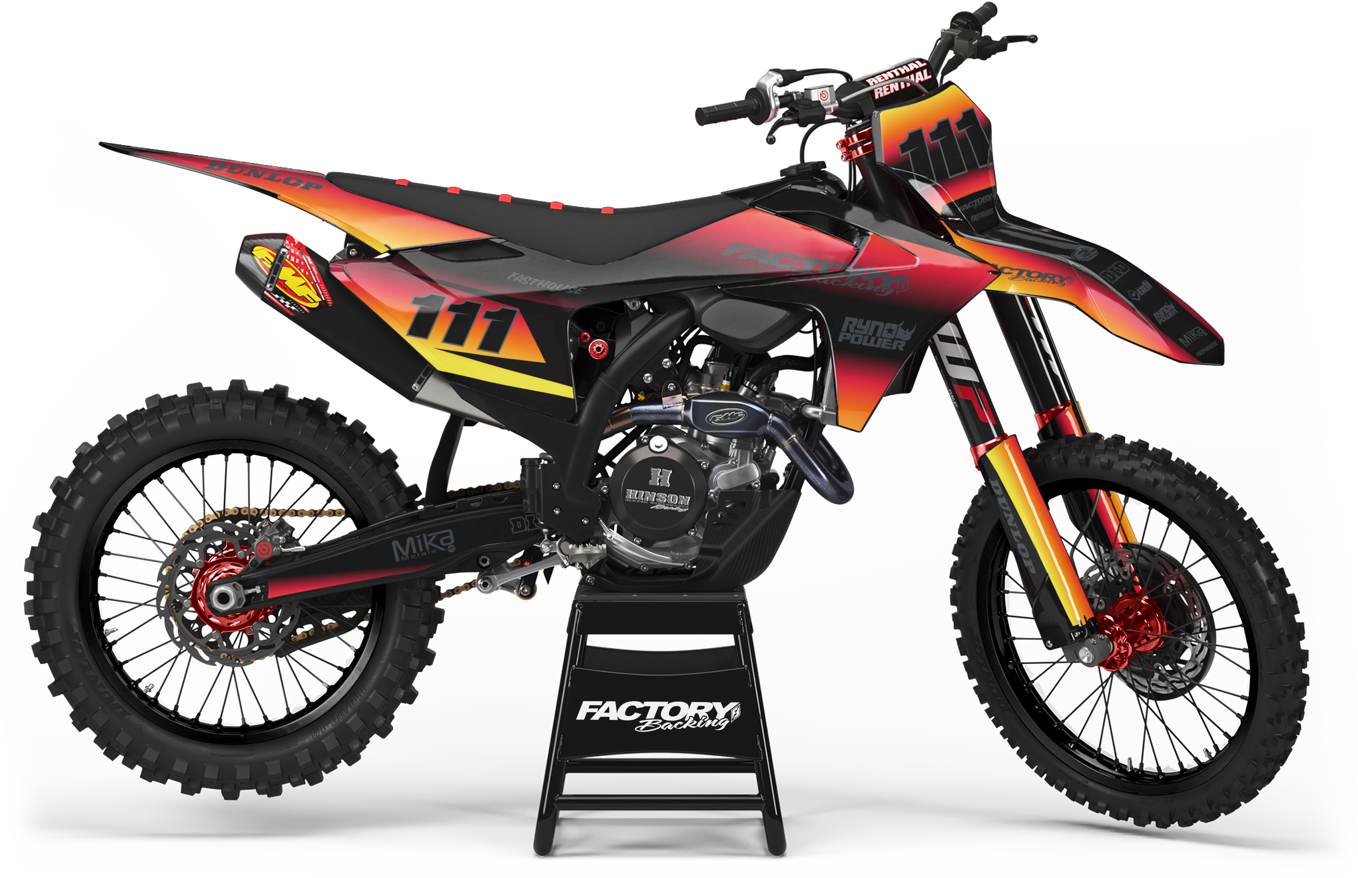 Full  graphic kits come custom with your sponsors logo if desired, your number and colors printed on the industry's best vinyl by Substance®. Most models include graphics for shrouds, front tip, rear fender,  sides/front plate, swing arm, and fork decals.