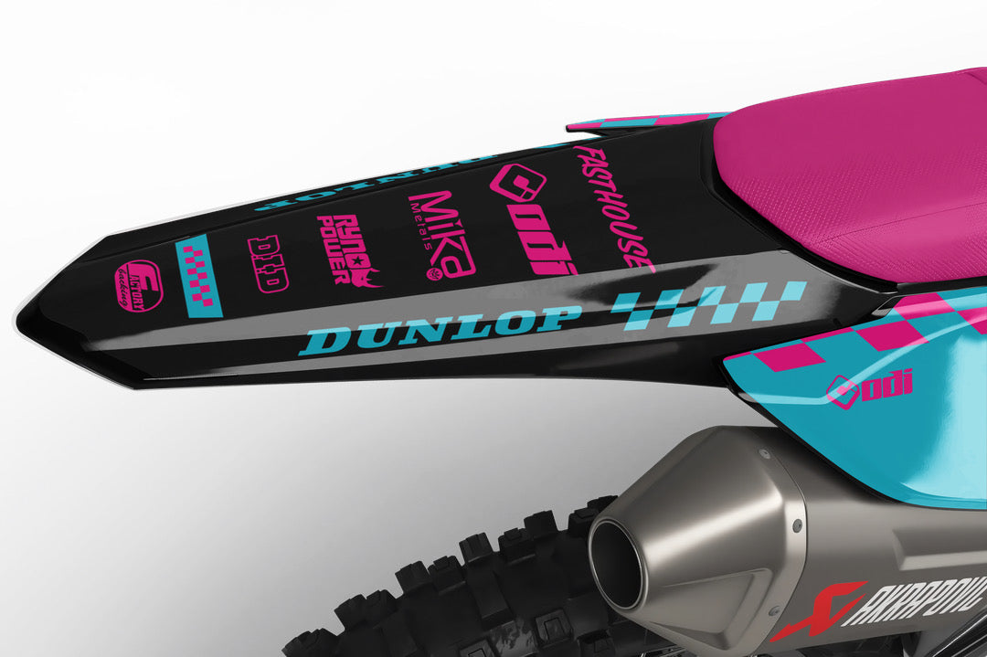 Full  graphic kits come custom with your sponsors logo if desired, your number and colors printed on the industry's best vinyl by Substance®. Most models include graphics for shrouds, front tip, rear fender,  sides/front plate, swing arm, and fork decals.