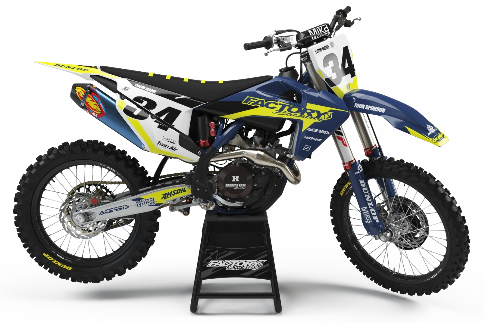 Full  graphic kits come custom with your sponsors logo if desired, your number and colors printed on the industry's best vinyl by Substance®. Most models include graphics for shrouds, front tip, rear fender,  sides/front plate, swing arm, and fork decals.