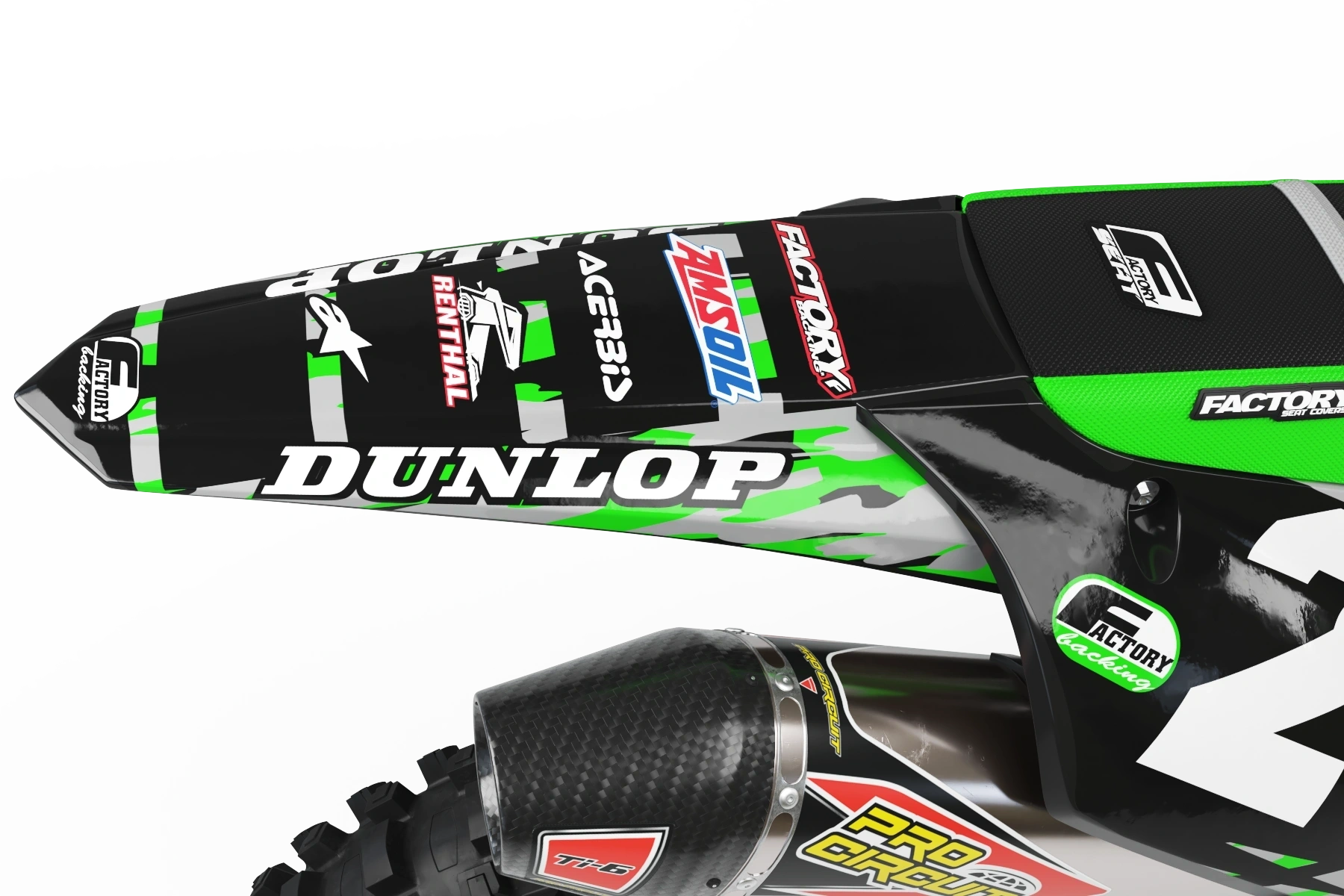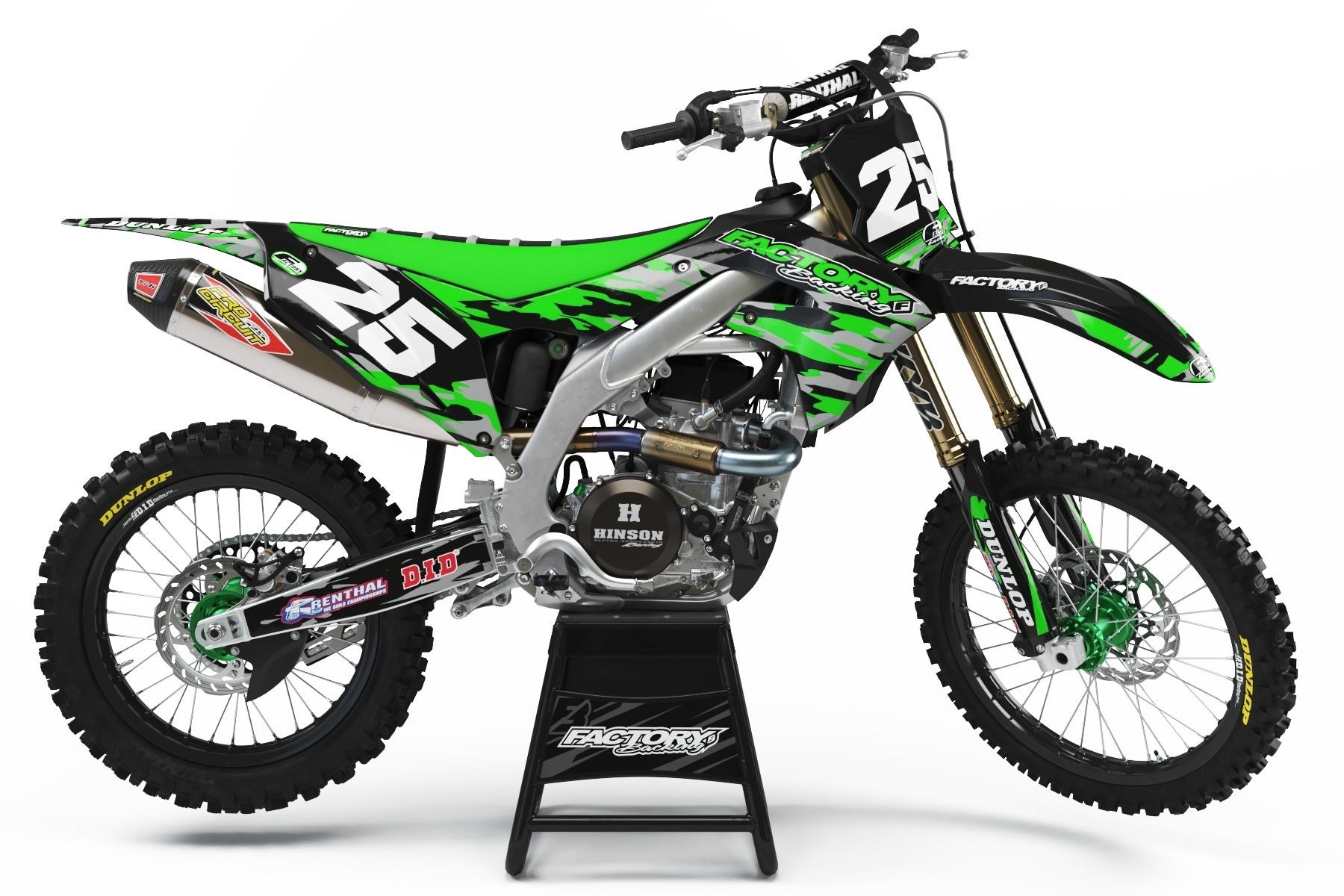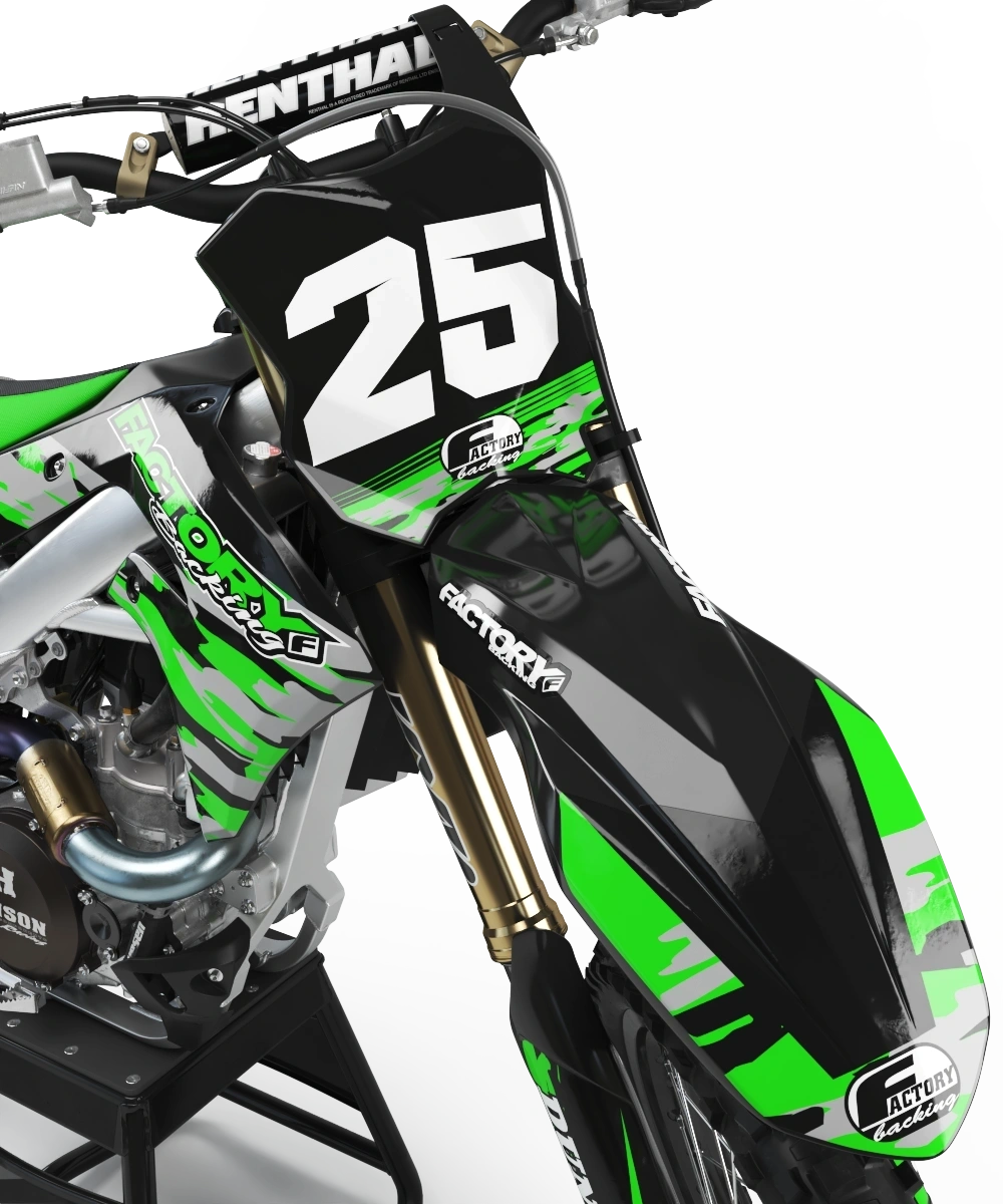 Full  graphic kits come custom with your sponsors logo if desired, your number and colors printed on the industry's best vinyl by Substance®. Most models include graphics for shrouds, front tip, rear fender,  sides/front plate, swing arm, and fork decals.