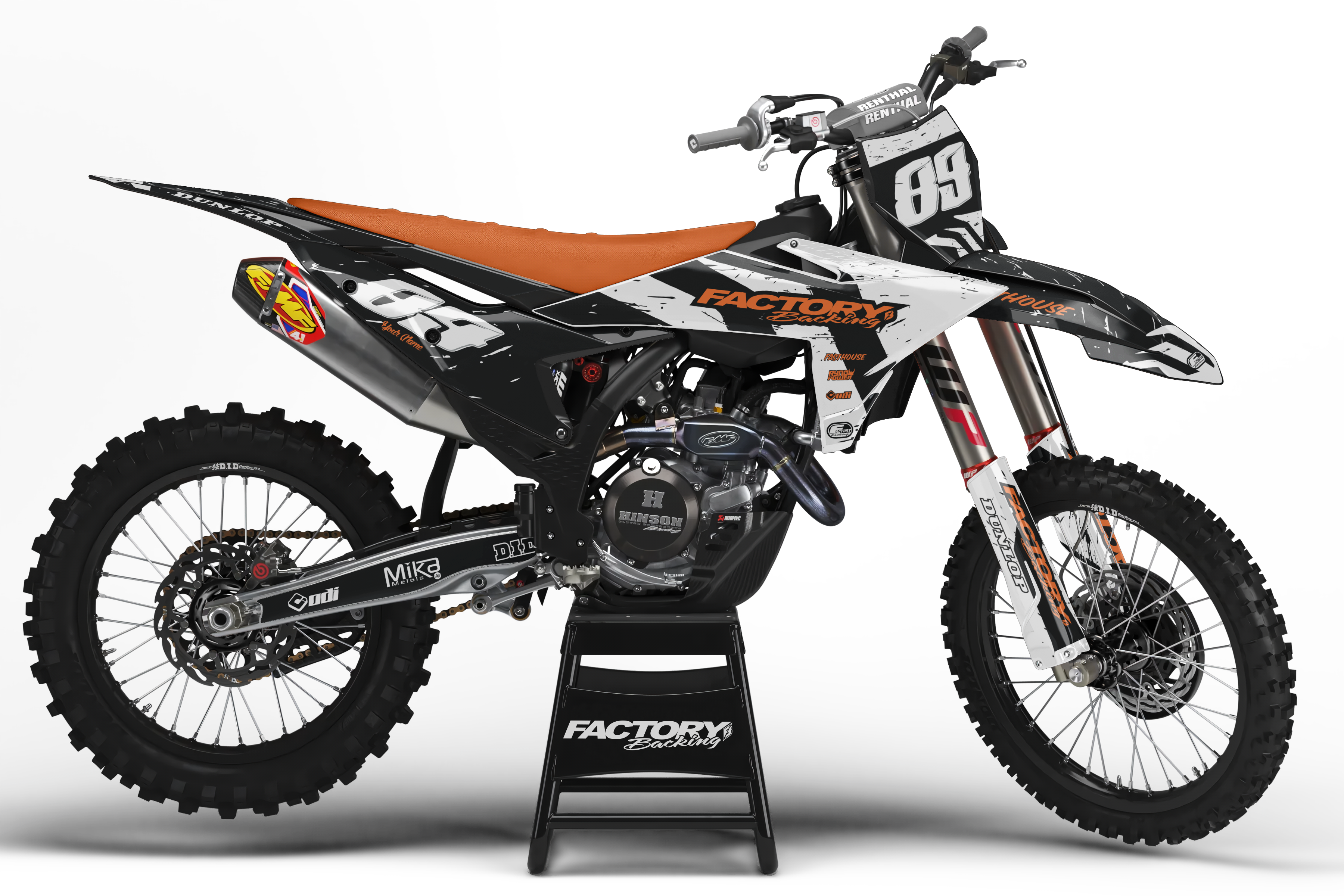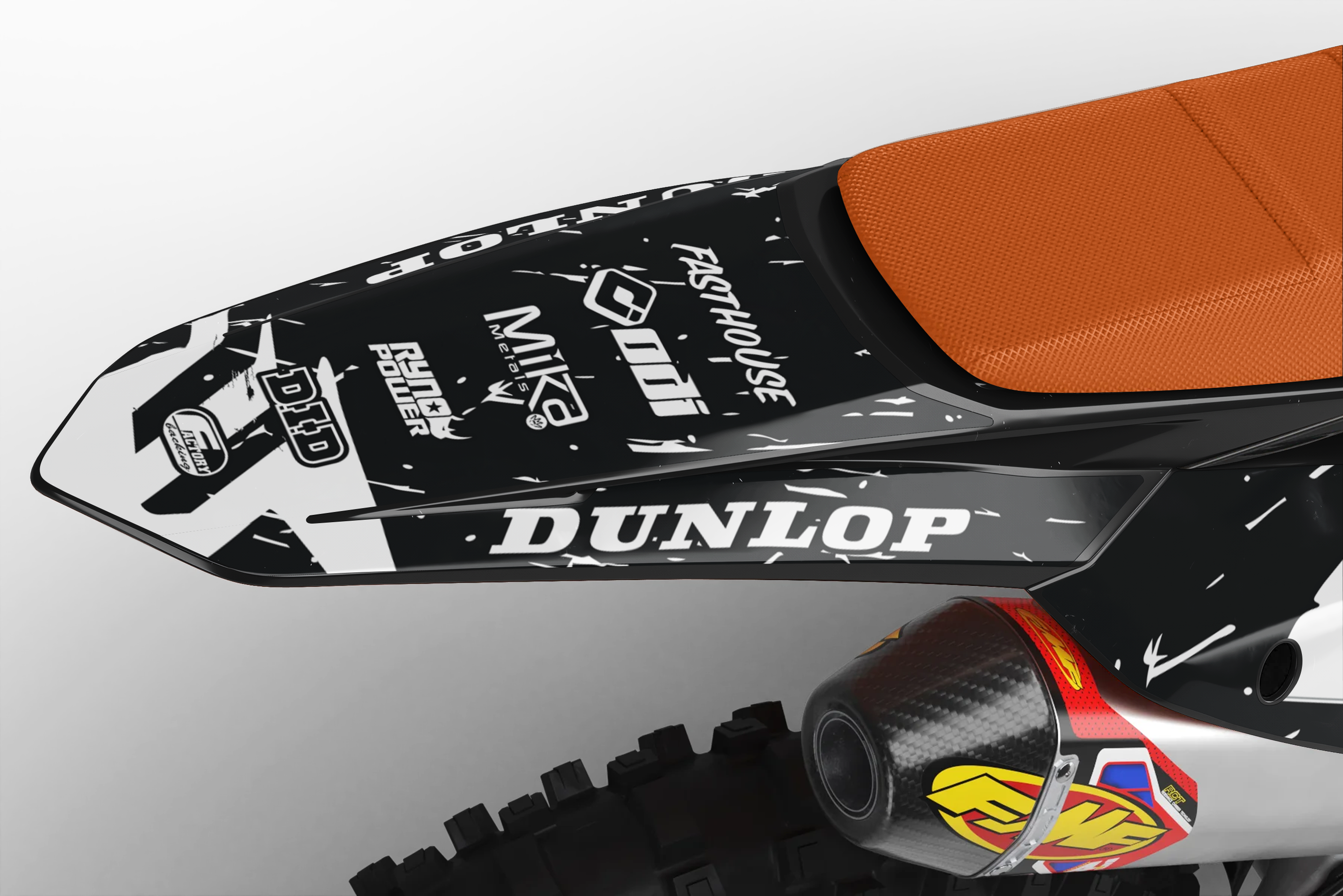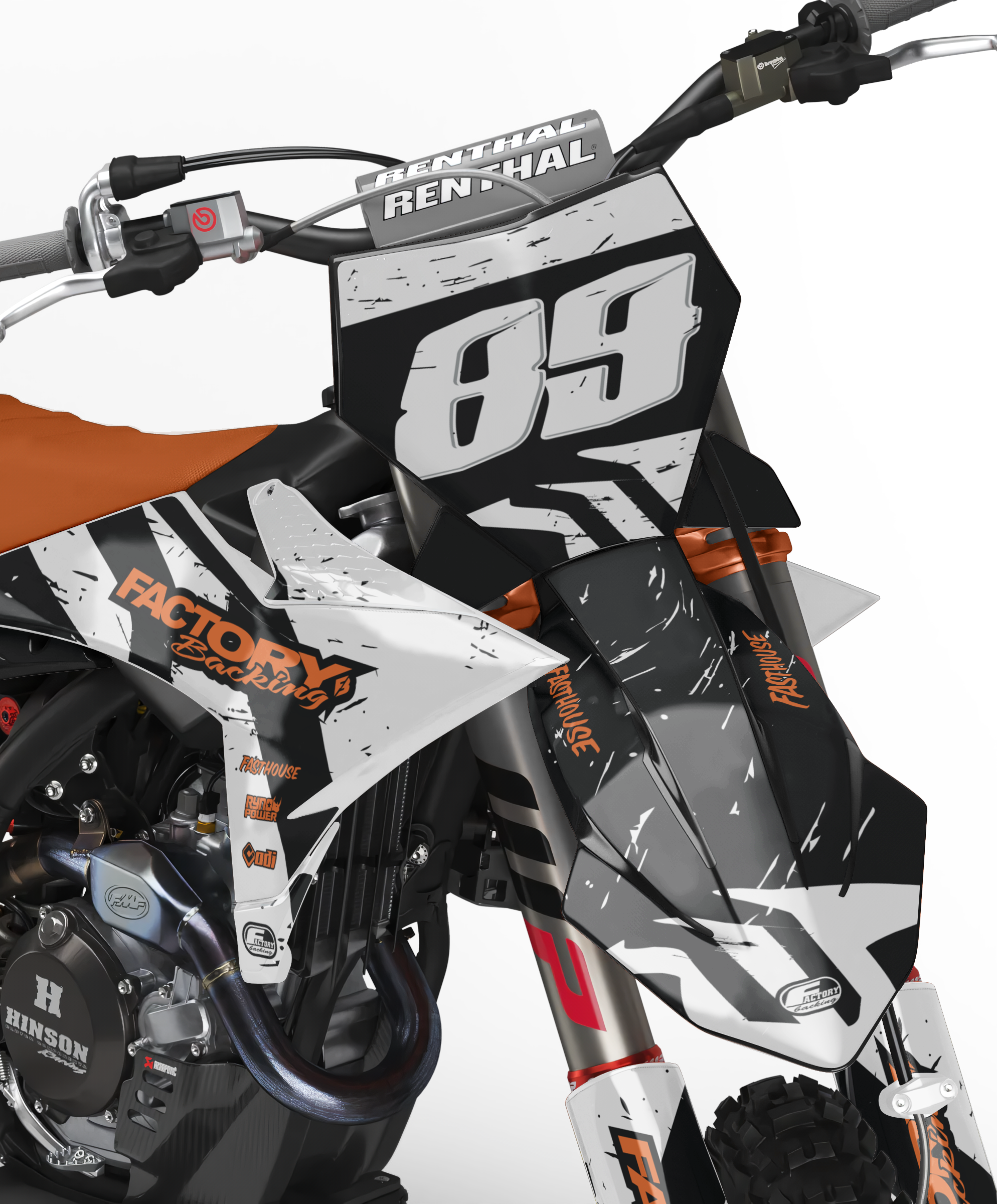 Full  graphic kits come custom with your sponsors logo if desired, your number and colors printed on the industry's best vinyl by Substance®. Most models include graphics for shrouds, front tip, rear fender,  sides/front plate, swing arm, and fork decals.