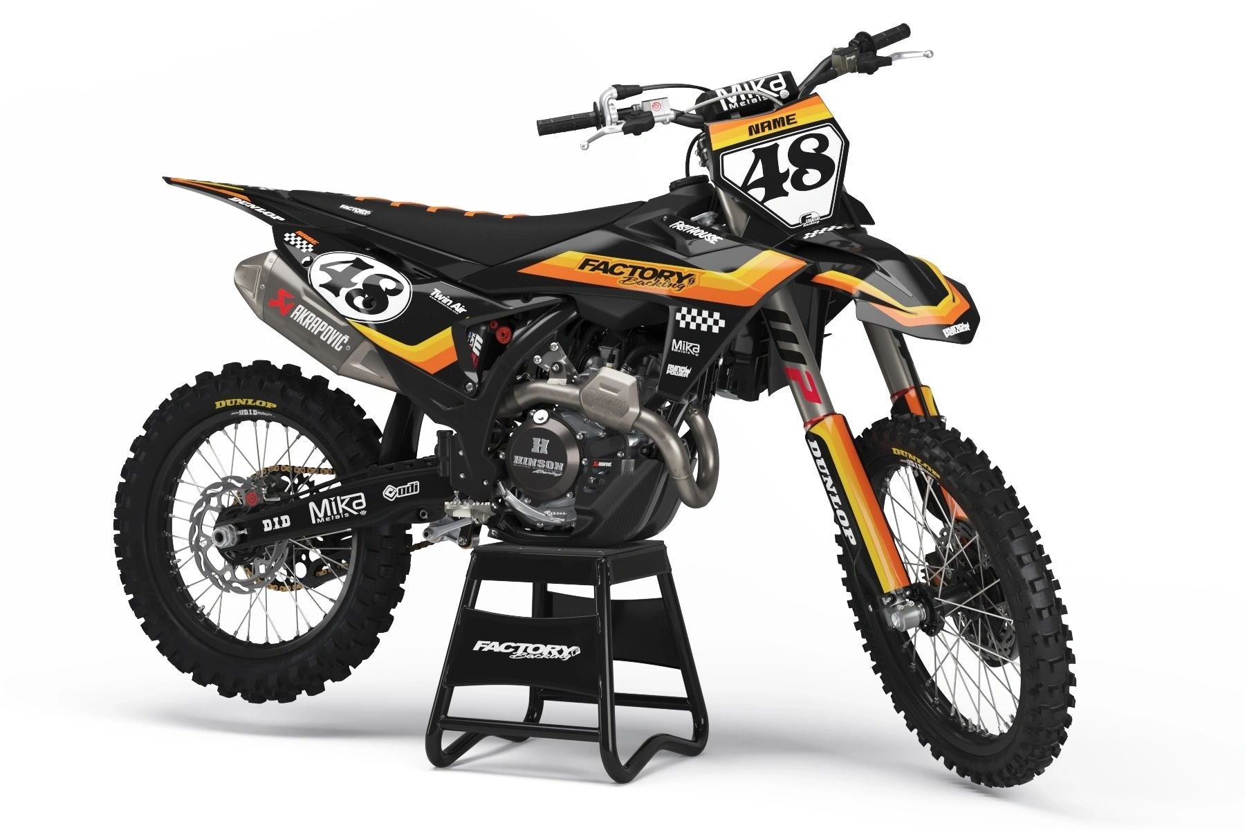 Full  graphic kits come custom with your sponsors logo if desired, your number and colors printed on the industry's best vinyl by Substance®. Most models include graphics for shrouds, front tip, rear fender,  sides/front plate, swing arm, and fork decals.