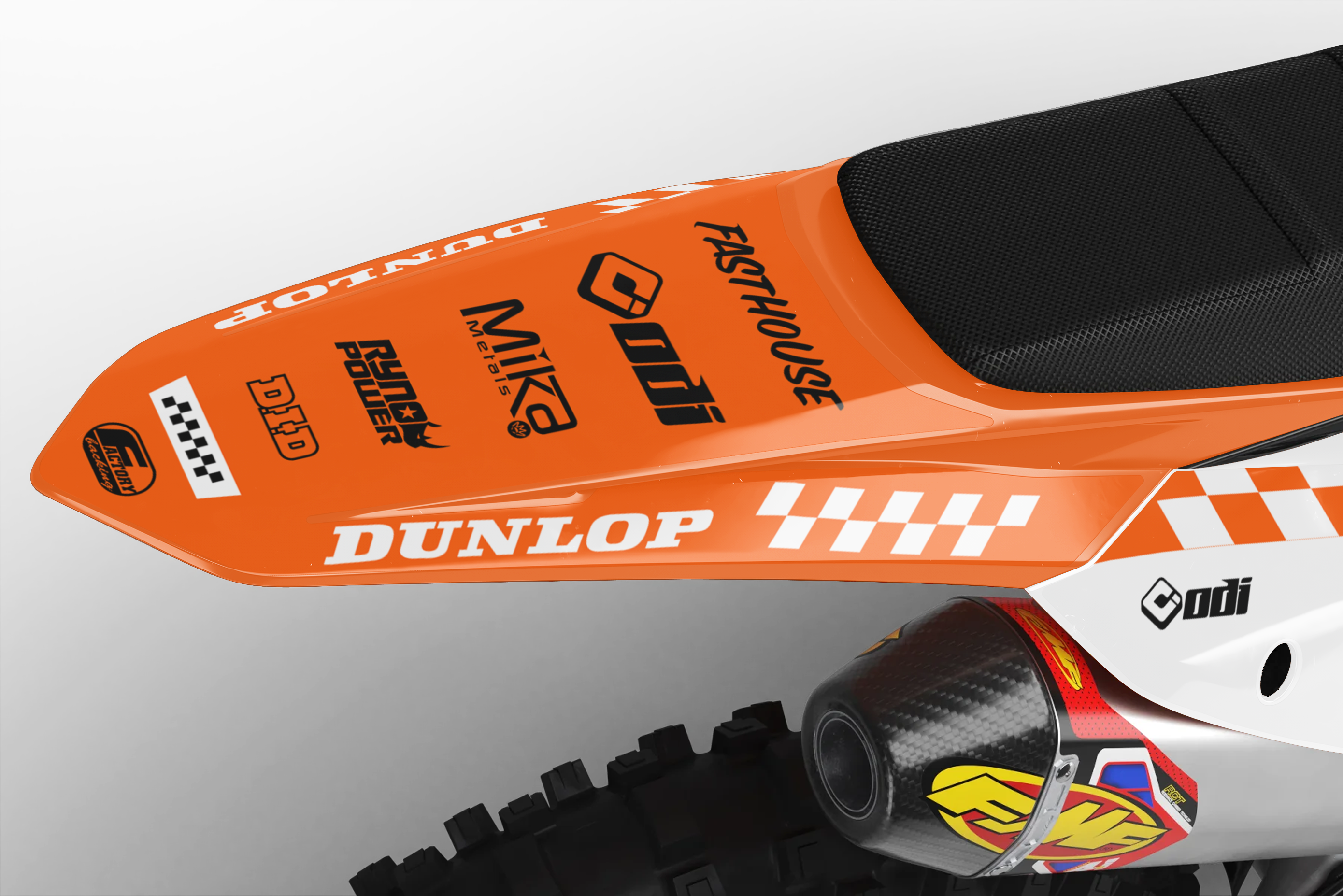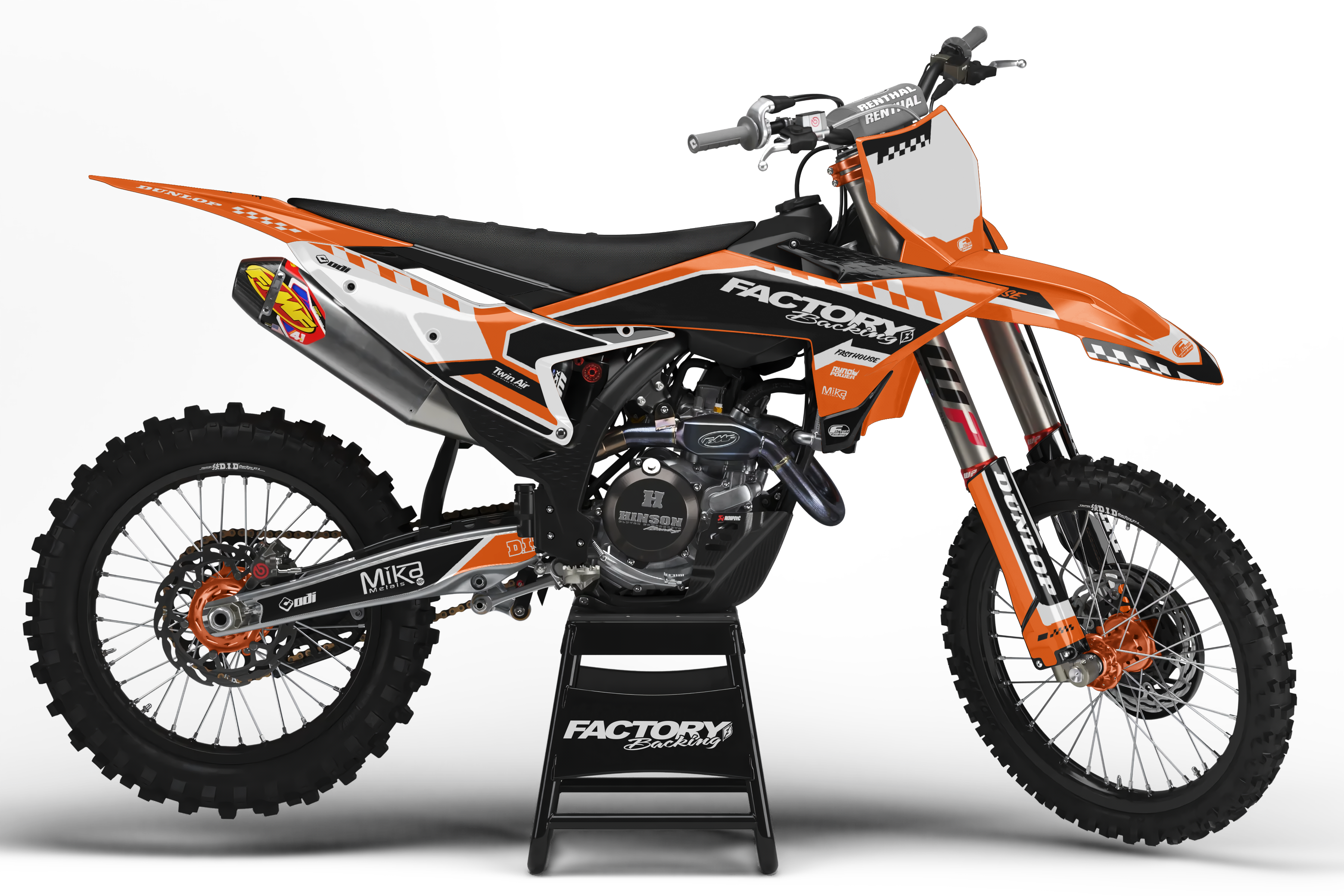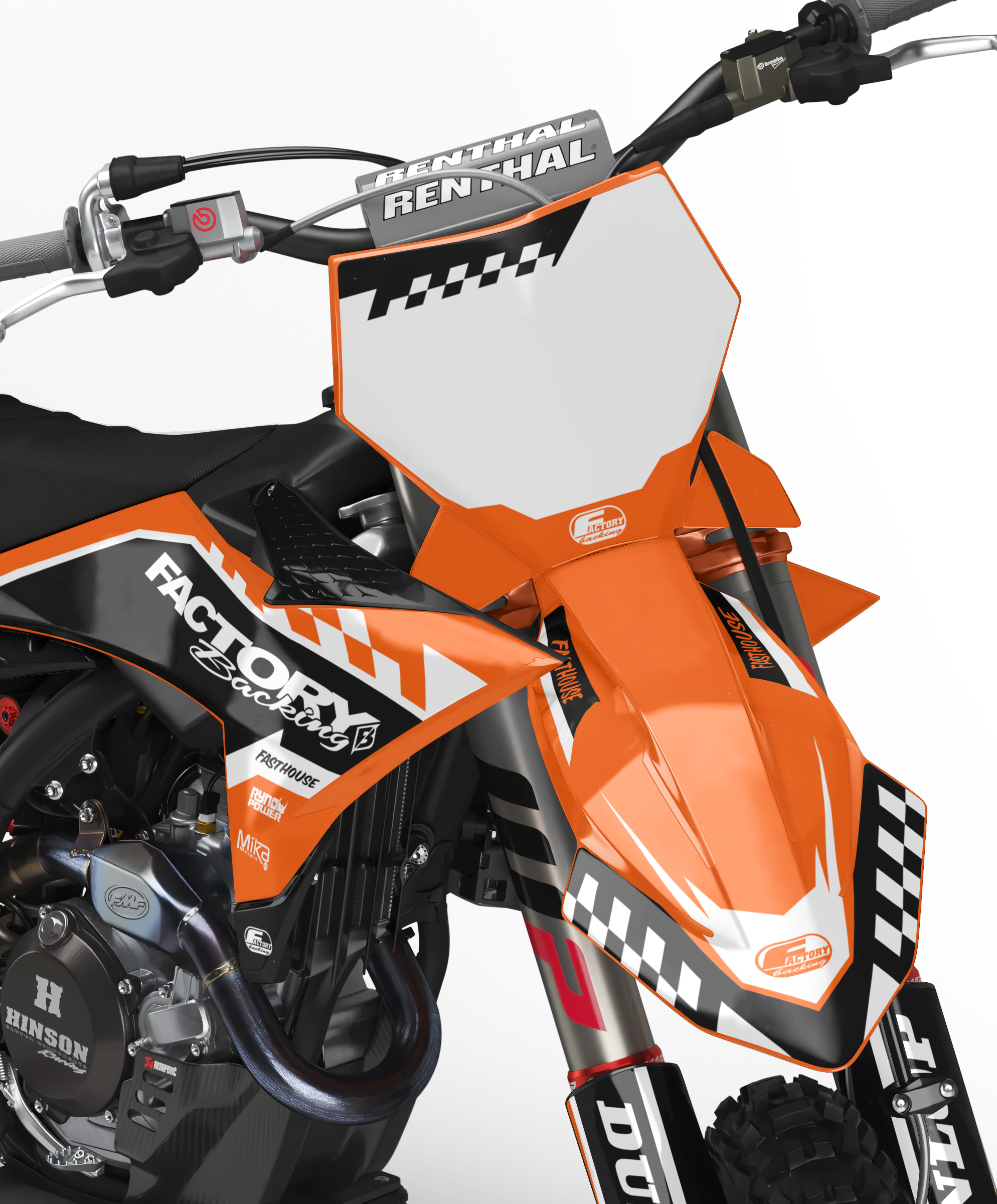 Full  graphic kits come custom with your sponsors logo if desired, your number and colors printed on the industry's best vinyl by Substance®. Most models include graphics for shrouds, front tip, rear fender,  sides/front plate, swing arm, and fork decals.