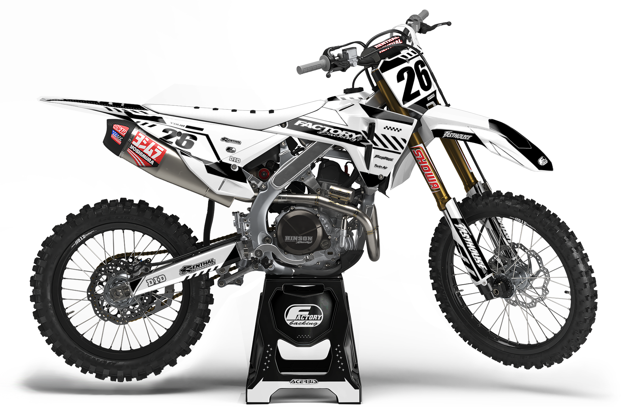 Full  graphic kits come custom with your sponsors logo if desired, your number and colors printed on the industry's best vinyl by Substance®. Most models include graphics for shrouds, front tip, rear fender,  sides/front plate, swing arm, and fork decals.