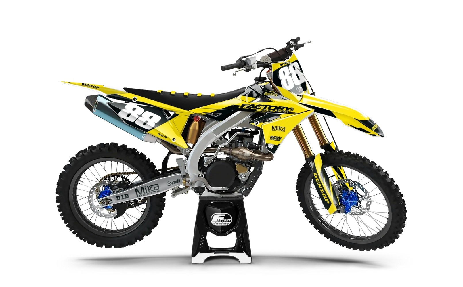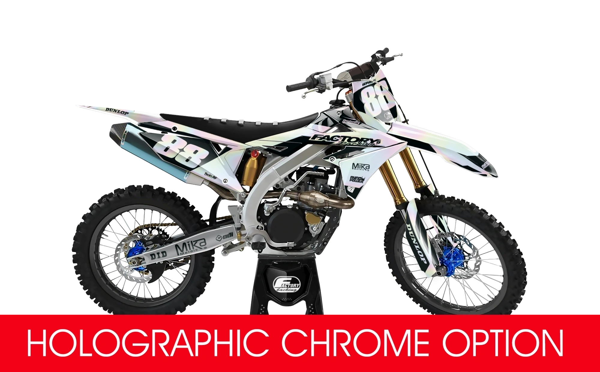 Full  graphic kits come custom with your sponsors logo if desired, your number and colors printed on the industry's best vinyl by Substance®. Most models include graphics for shrouds, front tip, rear fender,  sides/front plate, swing arm, and fork decals.