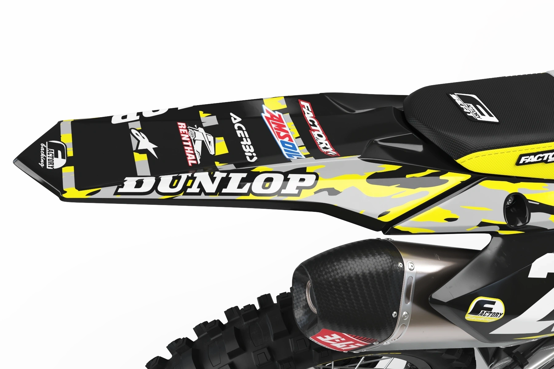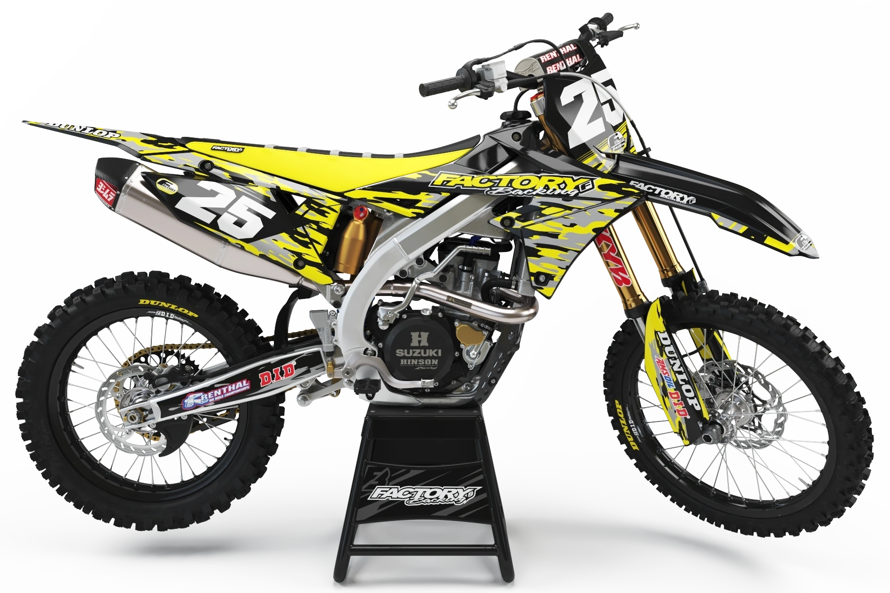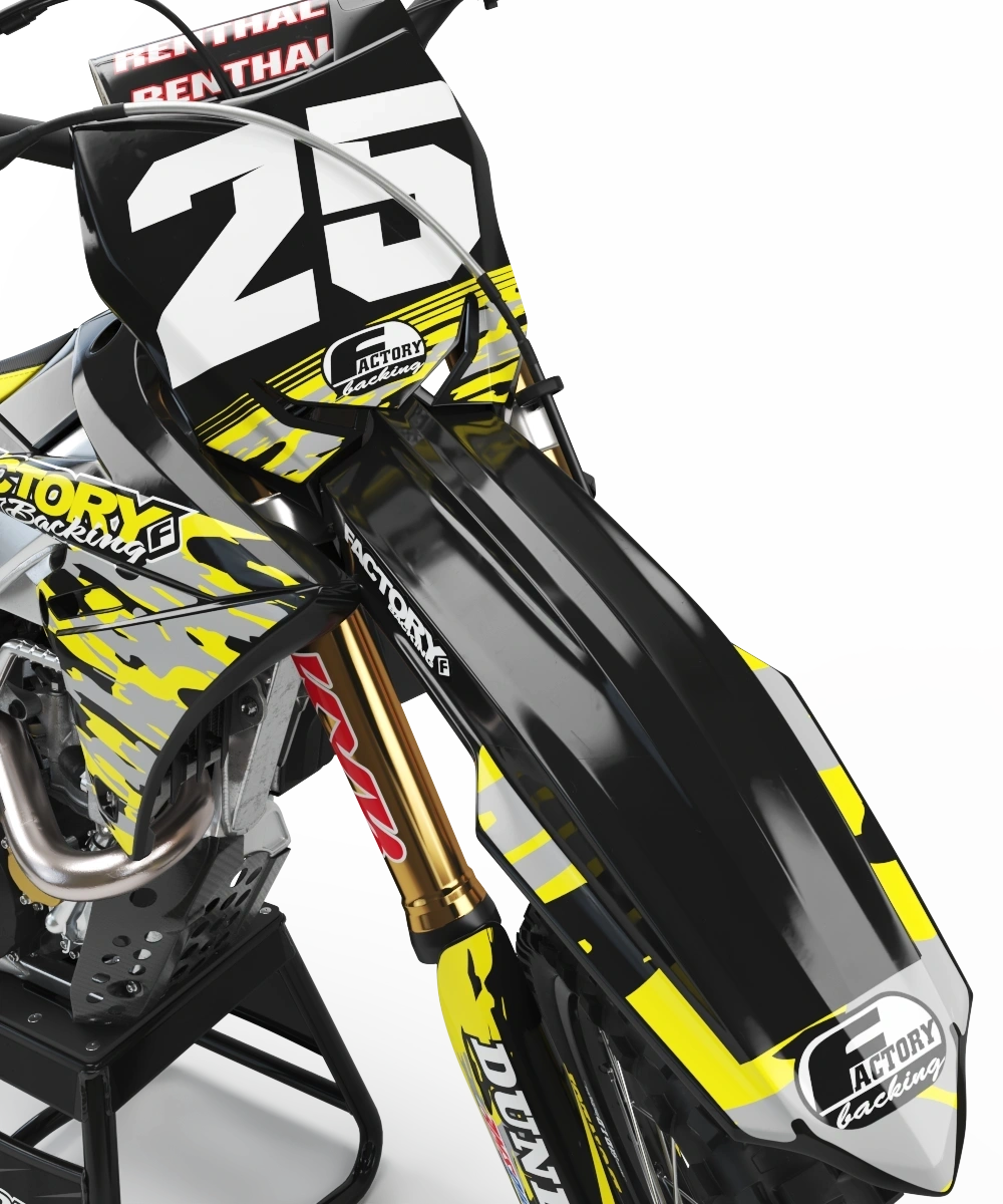 Full  graphic kits come custom with your sponsors logo if desired, your number and colors printed on the industry's best vinyl by Substance®. Most models include graphics for shrouds, front tip, rear fender,  sides/front plate, swing arm, and fork decals.