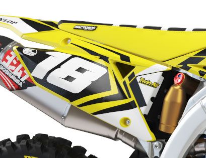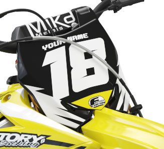 Full  graphic kits come custom with your sponsors logo if desired, your number and colors printed on the industry's best vinyl by Substance®. Most models include graphics for shrouds, front tip, rear fender,  sides/front plate, swing arm, and fork decals.