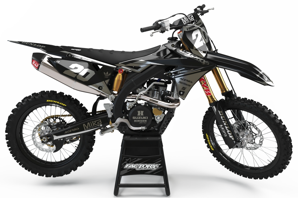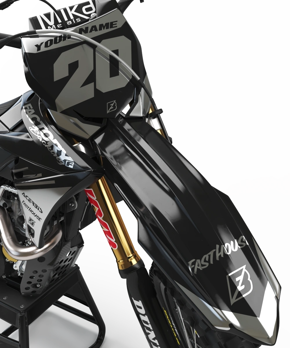 Full  graphic kits come custom with your sponsors logo if desired, your number and colors printed on the industry's best vinyl by Substance®. Most models include graphics for shrouds, front tip, rear fender,  sides/front plate, swing arm, and fork decals.
