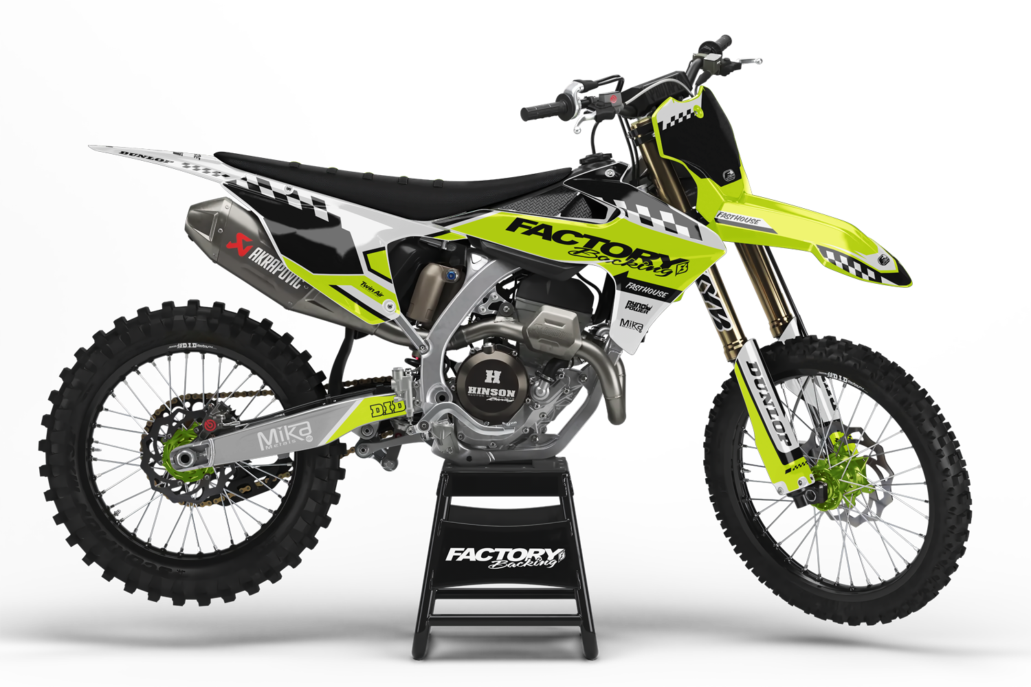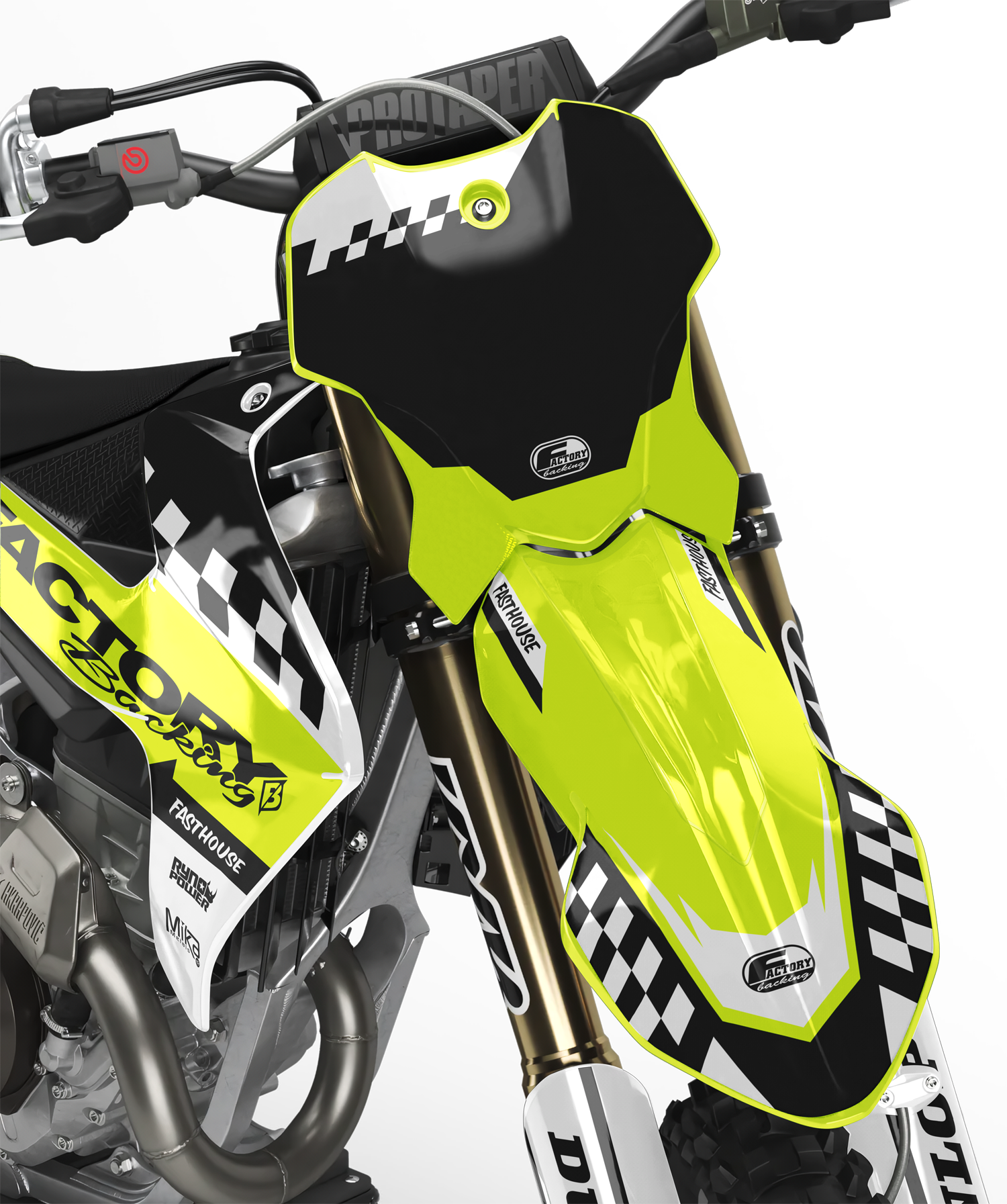 Full  graphic kits come custom with your sponsors logo if desired, your number and colors printed on the industry's best vinyl by Substance®. Most models include graphics for shrouds, front tip, rear fender,  sides/front plate, swing arm, and fork decals.